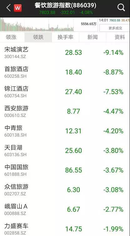 受此次武汉肺炎事件影响的不仅是影视股,当天,餐饮旅游板块也同样出现了惊人的下跌。