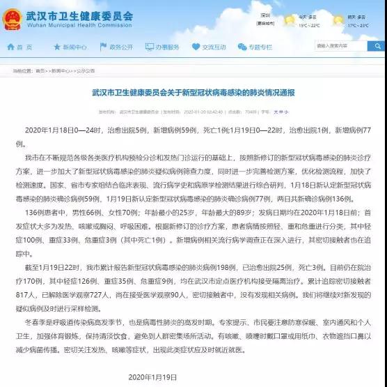 1月19日,据武汉市卫健委通报,2020年1月18日0—24时,治愈出院5例,新增病例59例,死亡1例;1月19日0—22时,治愈出院1例,新增病例77例。两日共新确诊病例136例。