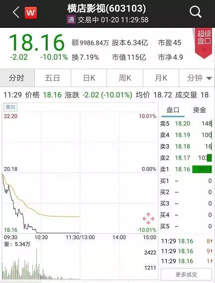 而此前连续走出近期股价新高的横店影视,今日的表现也令人大跌眼镜。当天横店影视开盘不到一小时就出现了一字跌停。截至午盘收盘,横店影视报收18.16元,市值为115亿。