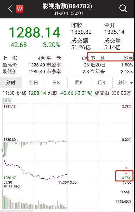 1月20日开盘,影视指数大幅走低,盘中跌幅一度逼近4%,场内资金先后出逃。短短半日,近2800多亿影视板块已经蒸发了近100亿。截至午盘收盘,影视指数报收1288.14,跌幅3.20%。
