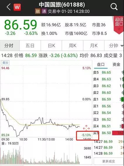 同时,市值仅1600多亿的龙头股中国国旅当天也出现了大跌,盘中一度跌超5%以上。截至下午两点三十分左右,中国国旅股价报收86.59元,股价跌幅超3.63%。