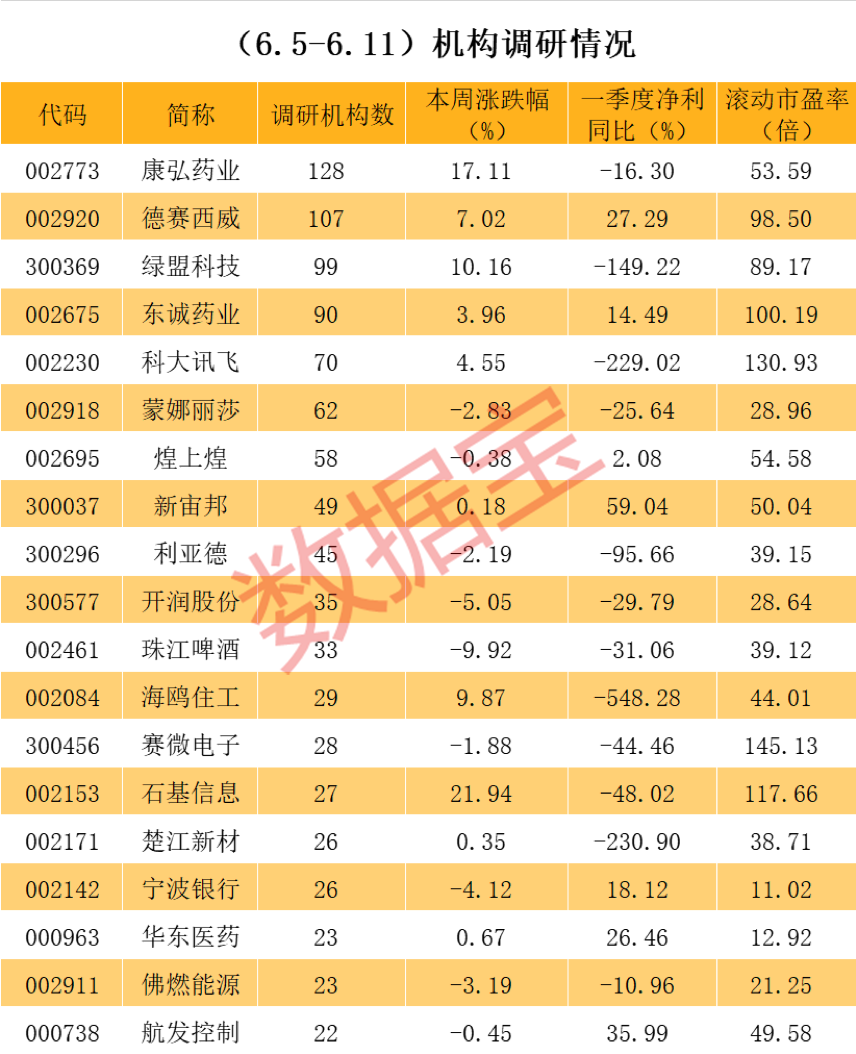近一周机构调研个股数量有130多只,康弘药业成为调研机构数量最多的股票。