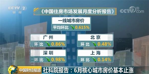 据央视财经报道,7月29日,中国社科院财经战略研究所发布6月《中国住房市场发展月度分析报告》。报告显示,6月,全国核心城市新房价格基本停止上涨,总体实现房价稳定目标。