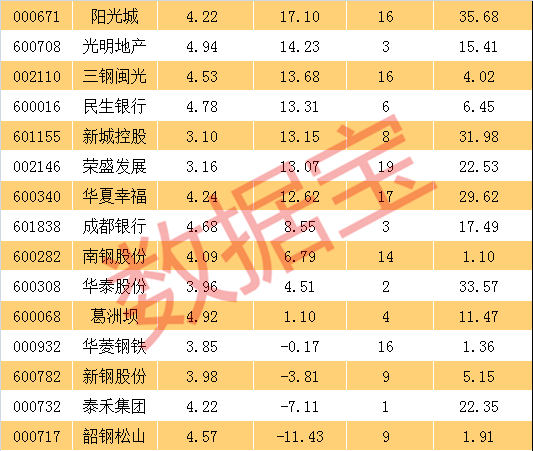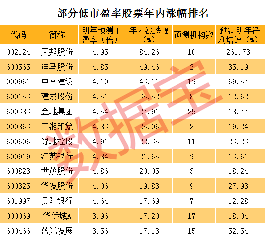 由于已经进入四季度,大多数股票有可能切换到2020年进行估值。数据宝统计显示,按照机构一致预测,28只股票明年预测市盈率低于5倍。其中,预测市盈率最低的股票是新城控股,8家机构一致预测明年市盈率3.01倍榜单最低。荣盛发展位居次席,19家机构一致预测明年市盈率3.16倍。蓝光发展位居第三位,15家机构一致预测明年市盈率3.56倍。此外,华菱钢铁、华侨城A、华泰股份、新钢股份等个股明年预测市盈率低于4倍。