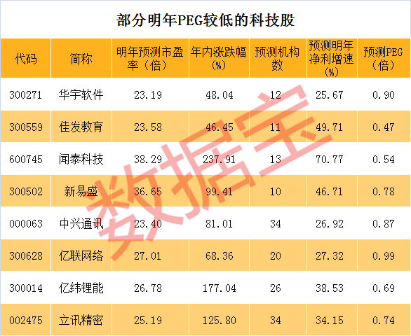 PEG最低的股票是通宇通讯,明年预测市盈率不足35倍,净利增速超过130%,PEG仅0.26倍。欣旺达、三利谱、大族激光、利亚德等个股PEG不足0.4倍,洲明科技、国星光电、苏州科达、佳发教育等个股PEG不足0.5倍。