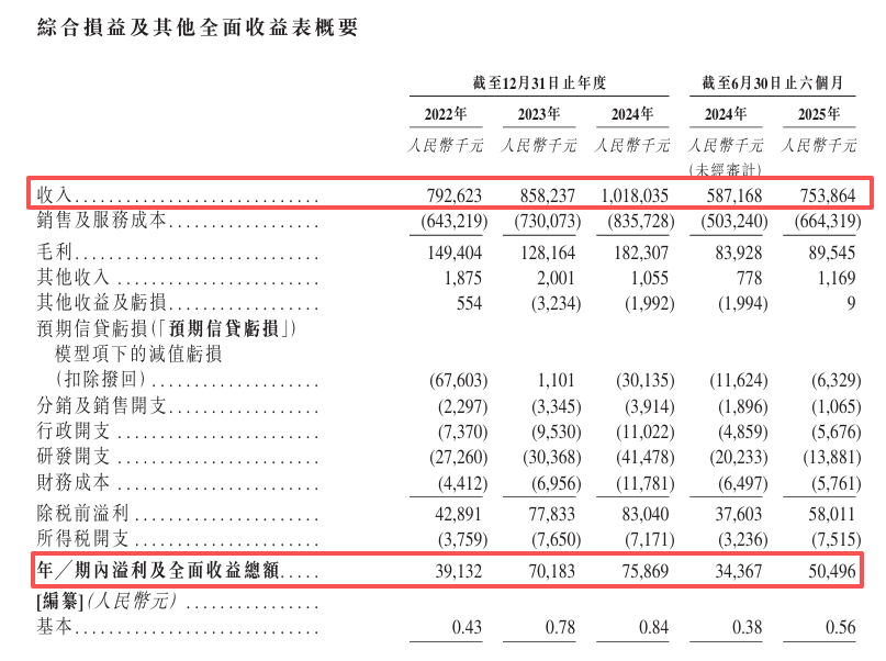2022年、2023年、2024年以及2025年上半年,公司营业收入约为7.93亿元、8.58亿元、10.18亿元以及7.54亿元,公司净利润分别约为0.39亿元、0.7亿元、0.76亿元及0.5亿元。