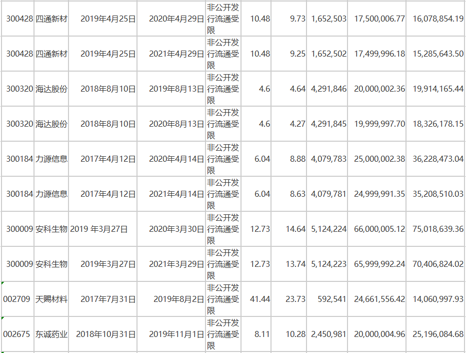 下图为九泰锐益定增基金2019年度半年报中所披露的流通受限股(目前部分已可流通)。可以看到,图中23次定增中,截至2019年6月30日,按公允价值计算,盈利的有11个,而亏损的有12个。其中,宁波高发和天赐材料的定增项目浮亏最为严重,股价相比当初的认购价已几近腰斩;而春秋航空盈利最多,股价相比当初的认购价上涨43%。