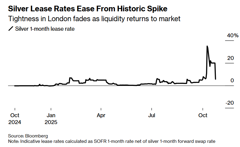 根据机构编制的数据,白银租借利率——即在伦敦白银交易市场借入该贵金属的年化成本,在周一下降至5.6%,此前在10月9日曾经飙升至历史峰值34.9%。