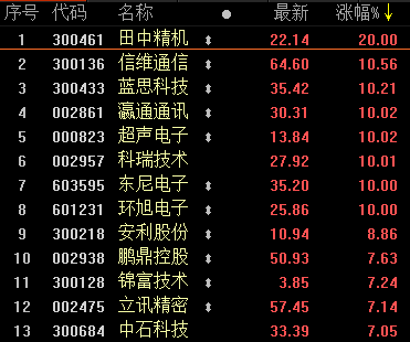 受多重利好预期影响,8月24日A股苹果概念板块集体狂欢,田中精机大涨20%、信威通信大涨10.56%、蓝思科技大涨10.21%,瀛通通讯、超声电子、科瑞技术、东尼电子、环旭电子等多只个股悉数涨停。