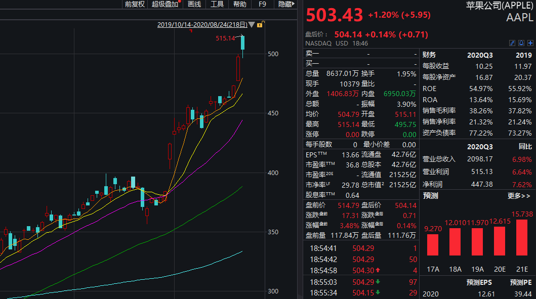 8月24日晚,苹果继续创造历史,股价开盘涨超3%,突破500美元/股,最高触及515美元/股,市值一度站上2.2万亿美元,最终报收503美元/股。