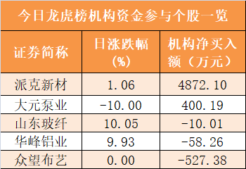盘后龙虎榜数据显示,机构现身5股,其中派克新材等2股呈现机构资金净买入,众旺布艺等3股呈现机构资金净卖出。
