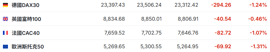 2. 截至发稿,德国DAX指数跌1.24%,英国富时100指数跌0.46%,法国CAC40指数跌1.07%,欧洲斯托克50指数跌1.31%。