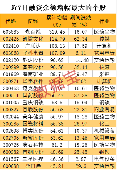分行业看,医药生物行业近7日融资余额增加52.03亿元,增加最多,融资余额增加居前的行业还有非银金融、电子等;融资余额减少的行业有有色金属、综合等。以幅度进行统计,传媒行业融资余额增幅最高,达7.15%,其次是家用电器、医药生物,增幅分别为6.64%、6.19%。