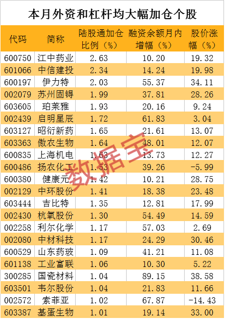 今日早盘,北上资金继续大幅流入A股,金额近21亿元,近五日已连续买入超280亿元。证券时报·数据宝统计,6月以来,北上资金持仓比例增加超1个百分点且杠杆资金加仓幅度超过10%的个股共有22只,股价平均上涨15.84%,医药板块个股最受外资和杠杆资金青睐。