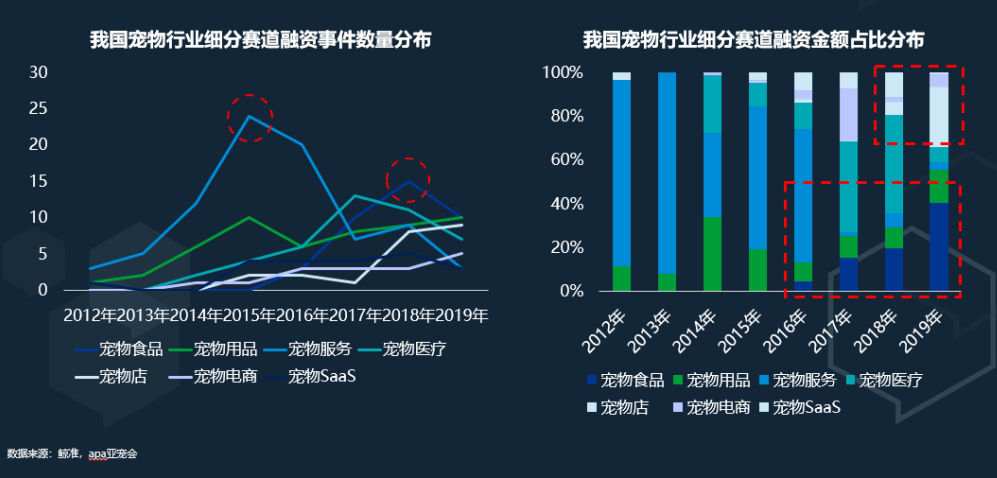 《蓝皮书》中显示,近年我国宠物产业各赛道融资规模均有不同程度的上升,其中上游宠物食品和下游宠物服务的融资规模分别在2018年、2015年迎来峰值,为最大的子行业。