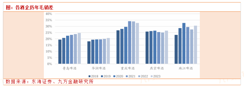 从毛销差看,青岛、华润啤酒每年稳定增长,燕京啤酒23年增长较多,重庆啤酒近年有所下降。