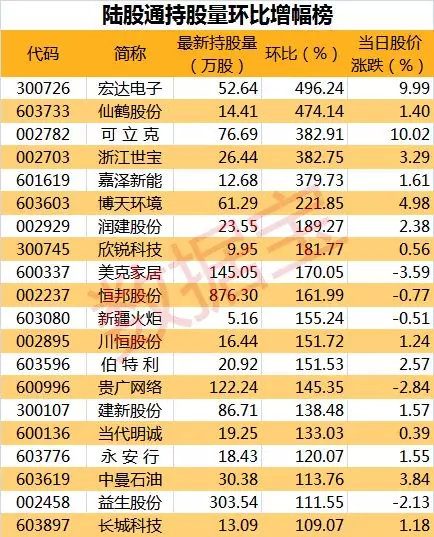 增仓幅度来看,相比前一交易日,持股量环比增幅在50%以上的共有44只,环比增幅最大的是宏达电子,陆股通最新持有52.64万股,持股量环比增幅达496.24%,昨日该股早盘即强势涨停,全天换手率为10.33%,主力资金净流入7449.62万元,今天上午再度大涨;其次是仙鹤股份、可立克,陆股通最新持股量分别为14.41万股、76.69万股,环比增幅为474.14%、382.91%,位居增仓榜第二、第三位。