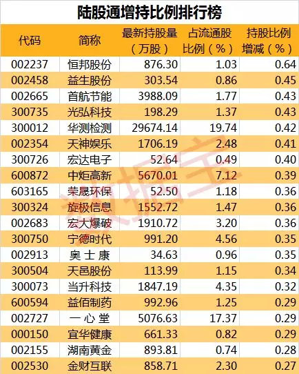 陆股通增持个股中,最新持股比例较前一日增加0.2%以上的共有36只,增加比例最多的是恒邦股份,陆股通最新持股量为876.30万股,占流通股比例为1.03%,持股占比较上一日增加了0.64%;其次是益生股份,持股比例较上一日增加了0.45%;首航节能持股比例较上一日增加0.43%,增加比例位居第三位。