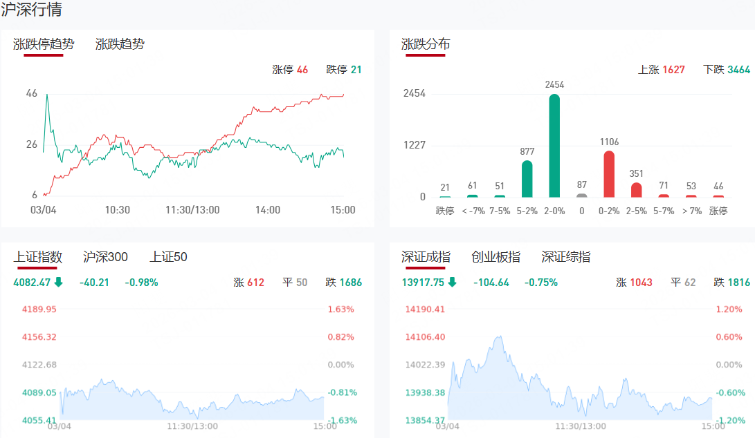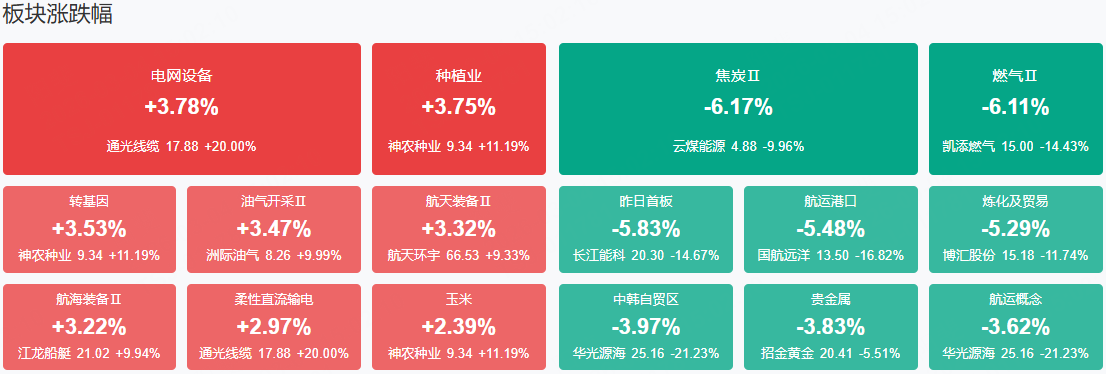 板块方面,电网设备、军工装备、农业股等板块表现活跃,煤炭、天然气、港口航运等板块表现落后。截至收盘,沪指跌0.98%,深成指跌0.75%,创业板指跌1.41%。