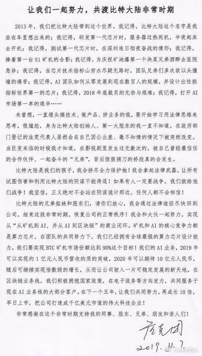 全球最大矿机芯片公司的权力争夺战进一步升级——比特大陆联合创始人、第一大股东詹克团正式发布声明称,会通过法律途径尽快回到公司,结束这段非常时期,恢复公司的正常秩序。