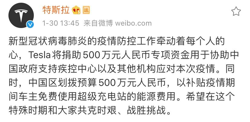 1月30日,特斯拉宣布将捐助500万元人民币专项资金,用于协助中国政府支持疾控中心,以及其他机构应对本次疫情。