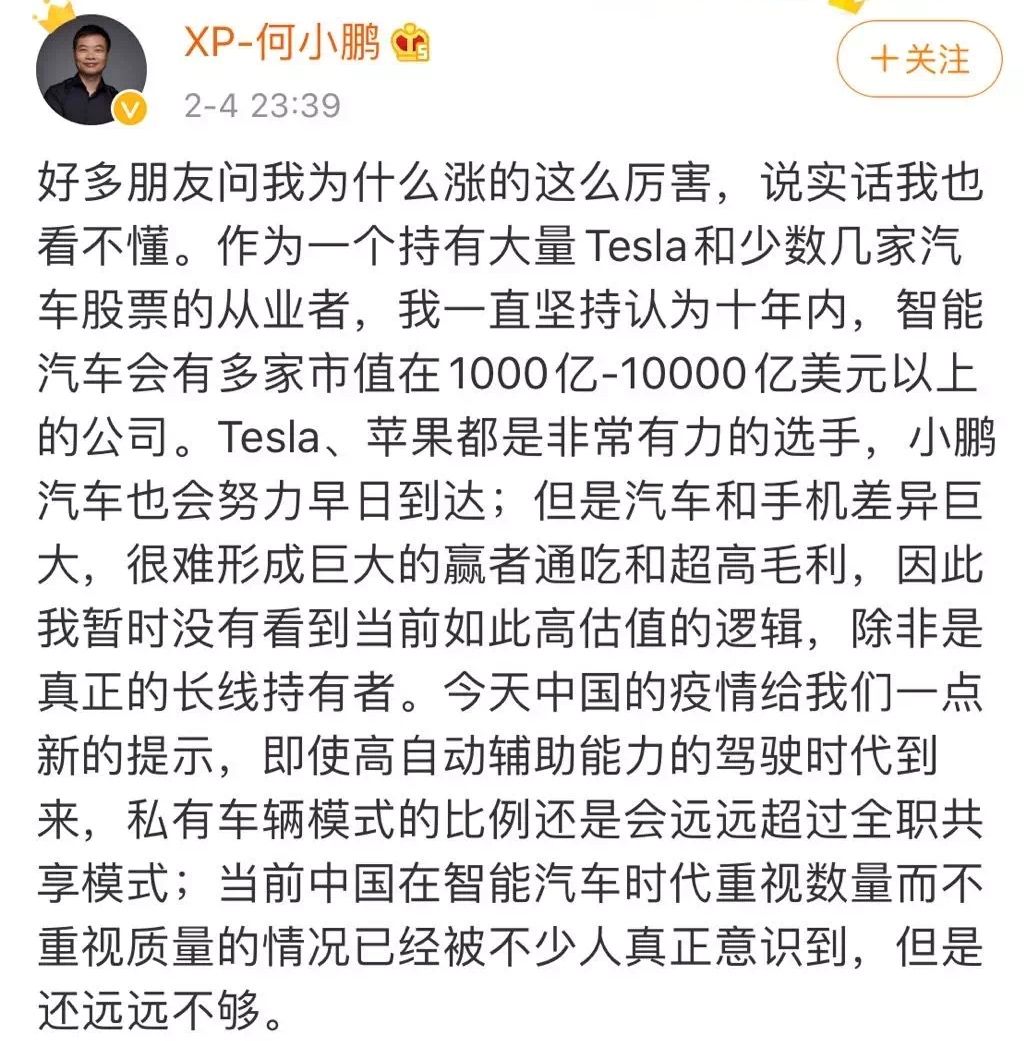 国内智能车企小鹏汽车的创始人何小鹏发文表示,汽车和手机差异巨大,很难形成巨大的赢者通吃和超高毛利,因此暂时没有看到当前如此高估值的逻辑;即使高自动辅助能力的驾驶时代到来,私有车辆模式的比例还是会远远超过全职共享模式。