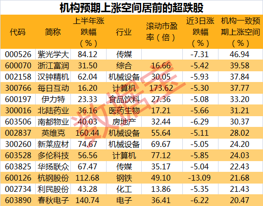 涨幅空间最大的是紫光学大,目标价距最新价有46%的上涨空间。最新滚动市盈率较低的公司有浙江富润、利民股份和北陆药业,均不足20倍。上半年涨幅最大的是英维克,累计上涨160%,春秋电子和杭钢股份涨幅均翻倍。上半年涨幅靠后的公司有每日互动、伊力特,分别上涨16%和23%。
