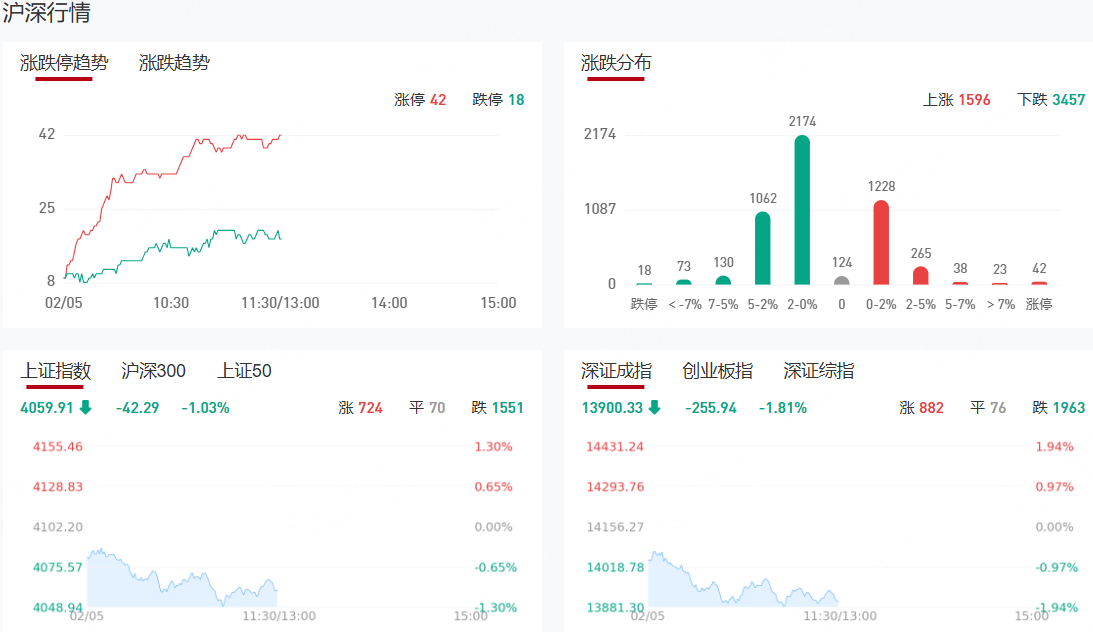 市场早盘震荡调整,三大指数均跌超1%。沪深两市半日成交额1.45万亿,较上个交易日缩量1682亿。盘面上热点较为杂乱,全市场超3600只个股下跌。从板块来看,大消费板块大涨,食品饮料、零售、影视院线方向涨幅居前,横店影视6天5板,杭州解百2连板,安记食品、海欣食品、金逸影视涨停。阿里概念局部异动,新华都直线涨停。算力租赁概念回暖,二六三封涨停。银行板块逆势拉升,厦门银行涨超6%。下跌方面,贵金属概念集体大跌,湖南白银跌停。算力硬件概念持续下挫,德科立、太辰光跌超10%。截至收盘,沪指跌1.03%,深成指跌1.81%,创业板指跌1.94%。