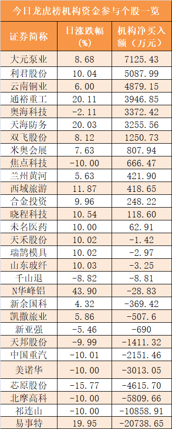 盘后龙虎榜数据显示,机构现身29股,其中大元泵业等14股呈现机构资金净买入,易事特等15股呈现机构资金净卖出。