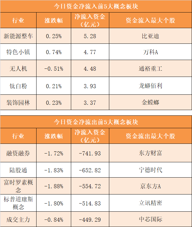 概念板块方面,今日新能源整车、特色小镇、无人机、钛白粉等概念板块资金呈现净流入,其中新能源整车概念净流入5.28亿元居首。