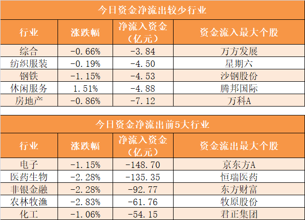 28个申万一级行业中,无一行业实现资金净流入,电子、医药生物、非银金融、农林牧渔等行业资金净流出规模居前,其中电子行业净流出148.70亿元居首。