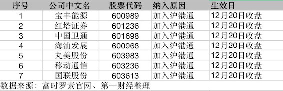 根据12月4日港交所公布的沪股通名单调整安排,富时罗素随后在此基础上对旗下指数做出调整——7只A股股票新纳入全球股票指数系列,29只A股股票调出指数。