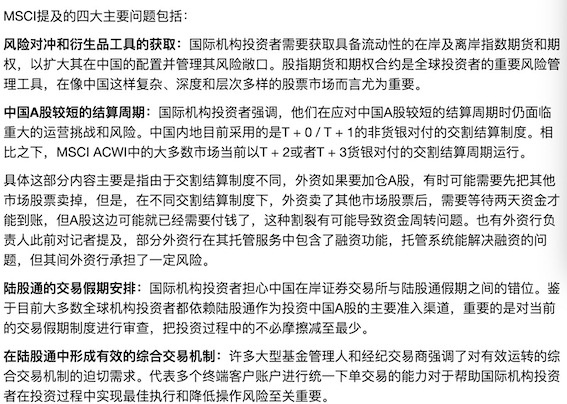 12月9日,富时罗素方面对第一财经记者表示,目前要等明年3月第三批次纳入结束后,再根据之前纳入的结果来决定如何进行下一阶段的市场咨询和评估;此前,MSCI方面对第一财经记者表示,只有对冲工具缺乏、结算周期短、交易假期不同、综合交易机制待形成等问题解决后,才会进一步将中国A股纳入MSCI指数的议题展开公开咨询。
