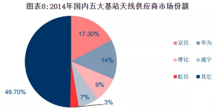 目前可以公开获得的数据是2014年国内基站天线供应商市场份额,前五大厂商分别是京信、华为、摩比、通宇、虹信。