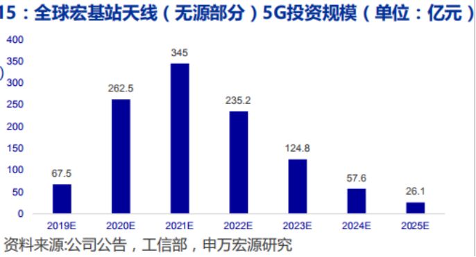 根据券商测算,在2021年5G建设高峰期,全球基站天线的市场规模可以达到345亿元,相比于2018年100亿左右的市场容量来讲,其行业增速将是非常猛的。