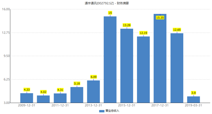 我们注意到,自从2016年上市以来,通宇通讯的业绩表现平平。2014年营收放量,高达15亿元,同比大增146.41%。其后,一路下滑,偶有年份反弹,但整体趋势是下滑的。