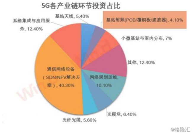 5G产业链非常长,包括通信网路设备、系统集成与应用服务、基站天线、基站射频、小基站、网络规划运维、光纤光缆、光模块等等。其中,基站天线占据整个5G产业链投资的4.1%。看似比重不高,但是蛋糕却不小。