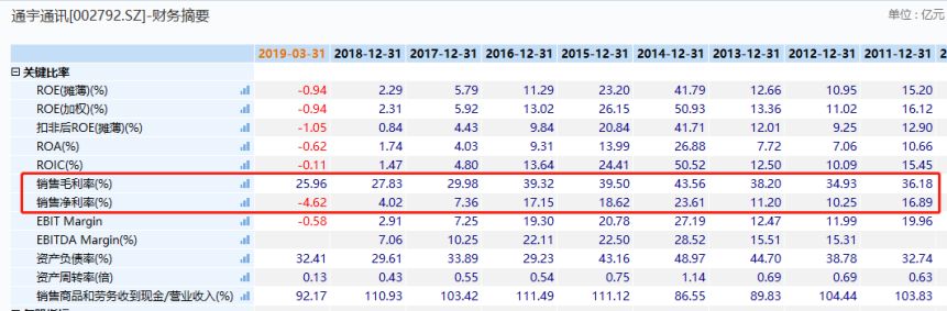 再看看毛利率,通宇最近3年持续下滑。2015—2018年,销售毛利率分别为39.5%、39.32%、29.98%、27.83%。2019年一季度更是下滑至25.96%。