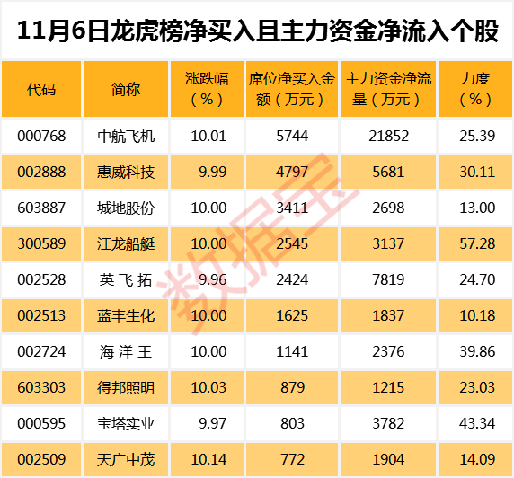 11月6日龙虎榜中机构及营业部席位资金净卖出1.17亿元,其中净买入的个股有16只;净卖出的个股有17只。净买入前三名个股分别是中航飞机(16.600, 1.51, 10.01%)、惠威科技(21.460, 1.95, 9.99%)、城地股份(24.200, 2.20, 10.00%)等,净买入金额占当日成交额比例达6.67%、25.43%、16.44%。
