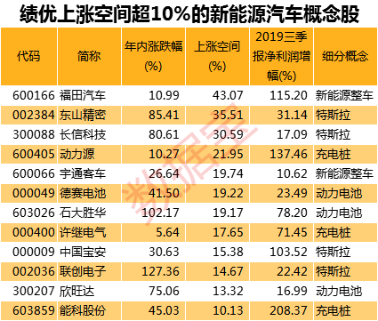 新能源整车概念股福田汽车(2.020, -0.02, -0.98%)前三季净利润增幅超100%,上涨空间超40%;上涨空间居次位的特斯拉概念股东山精密(20.880, -0.25, -1.18%),已经通过特斯拉供应商体系的认证,目前可为Model3提供结构件、冲压件、散热器等产品。该公司今年净利润增幅下限达到30%,上涨空间超35%。另外,长信科技(7.300, -0.08, -1.08%)、动力源(4.510, -0.03, -0.66%)、德赛电池(40.170, -0.32, -0.79%)等5股上涨空间都超过19%。