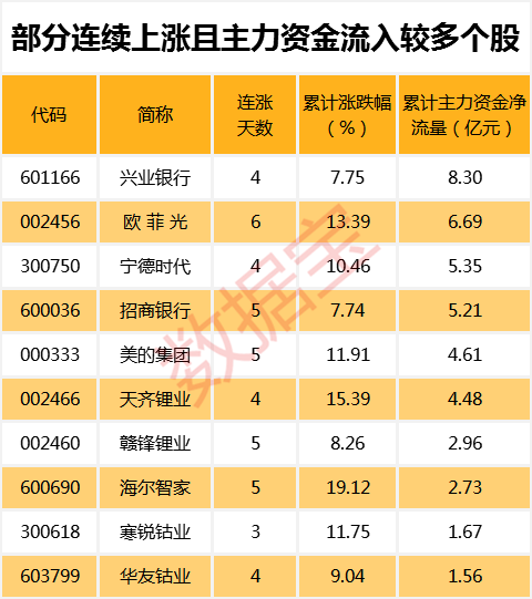 值得注意的是,221只连续上涨个股中,19只个股期间主力资金累计净流入超过亿元。其中,累计资金流入最多的为兴业银行(20.170, 0.17,0.85%),主力资金累计流入8.30亿元。