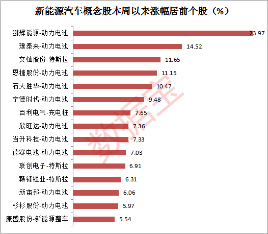 新能源汽车概念股本周以来表现呈现冰火两重天,101只概念股跑赢大盘个股仅44只,鹏辉能源(22.760, 0.54, 2.43%)、璞泰来(62.000, 3.34,5.69%)、文灿股份(17.640, 1.60, 9.98%)等5股本周以来累计涨幅超10%。其中鹏辉能源3天2板,主要生产锂离子电池及其它各种电池系列,公司基本上实现了新能源全产业链覆盖。鹏辉能源近1个月获国海证券(4.870,-0.07, -1.42%)、国金证券(8.540, -0.11, -1.27%)2家机构首次关注。