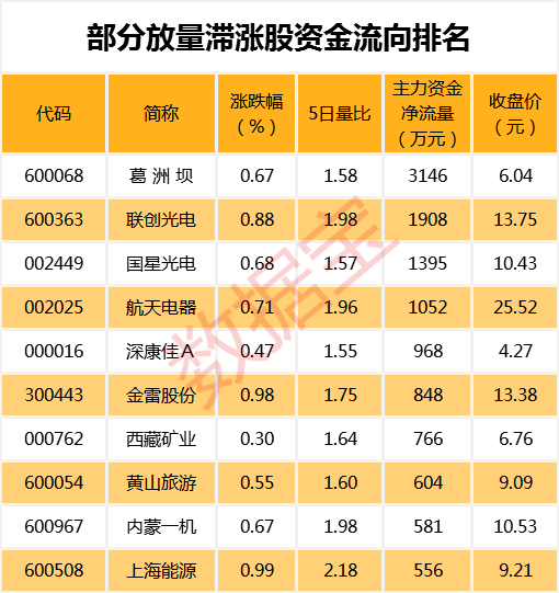 值得注意的是,59只放量滞涨股中,葛洲坝(6.040, 0.04, 0.67%)、联创光电(13.750, 0.12, 0.88%)、国星光电(10.430, 0.07, 0.68%)、航天电器(25.520, 0.18, 0.71%)、深康佳A(4.270, 0.02, 0.47%)等个股主力资金净流入较多。