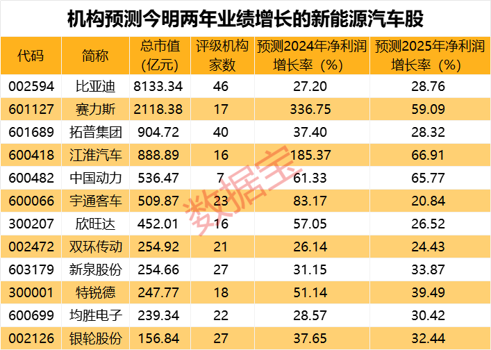 新能源汽车概念股中,有40余股获得至少5家及以上机构给予评级,业绩预期方面,机构一致预测12只概念股今年、明年两年的全年业绩有望持续超20%增长。