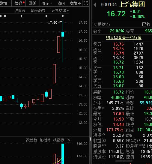 上汽集团早盘一度大跌超8%,午盘又快速拉起,涨幅一度近5%,收盘微跌0.06%。此前,上汽集团已连续两个涨停板。