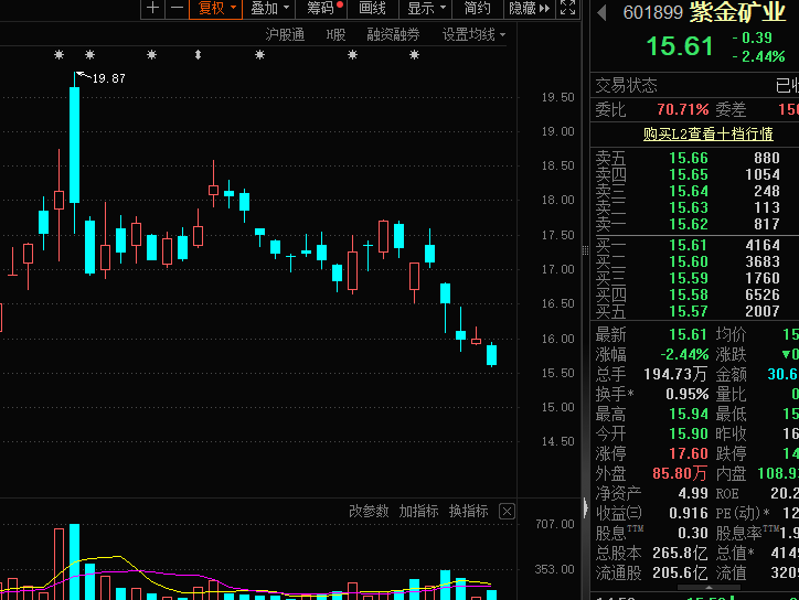 紫金矿业今日股价下跌2.44%。受国际金价走低影响,紫金矿业较高位累计回落超20%。