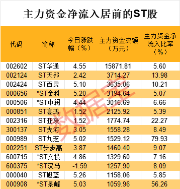 从资金面上看,今日ST板块获主力资金净流入0.28亿元,其中,66股获主力资金净流入,5股主力资金净流入超3000万元,净流入资金居首的是ST华通,主力资金净流入1.59亿元,净流入资金居前的还有ST天邦、ST百灵、*ST金科等,主力资金分别净流入3714.27万元、3635.06万元、3194.64万元。