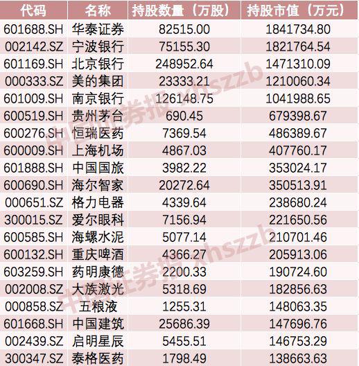 QFII持股市值最高的20只A股(截至2019年6月30日)