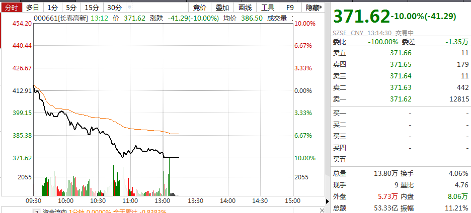 当前A股市场仍处于震荡状态,白马股突遭袭击,千亿市值的长春高新跌停,报371.62元,成交额超50亿元,截至发稿仍有1.28万手跌停价卖单封跌停,总市值跌至1504亿元。