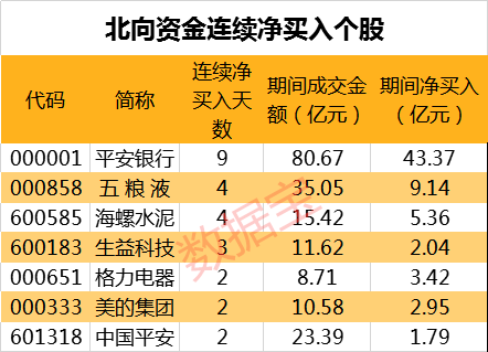 从近期净买入情况看,有7股已被北向资金连续净买入,平安银行已连续9日获净买入,期间累计成交金额80.67亿元,成交净买入43.37亿元,股价表现上,该股获北向资金连续净买入期间累计上涨11.59%。